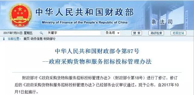 近日,从财政部官网了解到,财政部印发财政部令87号《政府采购货物和服务招标投标管理办法》。