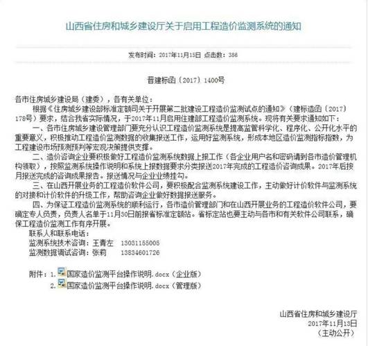 根据《住房城乡建设部标准定额司关于开展第二批建设工程造价监测试点的通知》(建标造函(2017)178号)要求,结合我省实际情况,于2017年11月启用住建部工程造价监测系统。为此,山西省住房和城乡建设厅在11月15日公开发布《山西省住房和城乡建设厅关于启用工程造价监测系统的通知》(晋建标函(2017)1400号)。