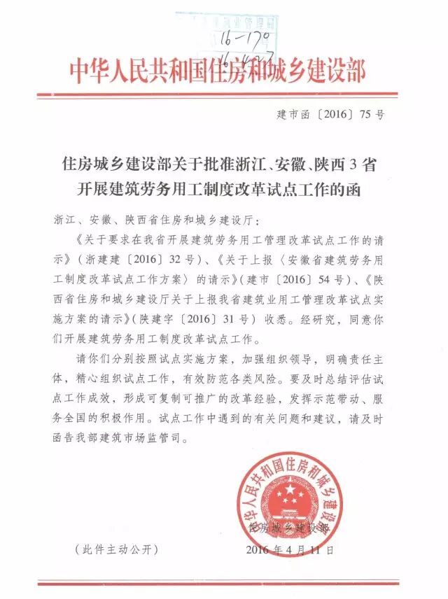 2.《住房城乡建设部关于批准浙江安徽陕西3省开展建筑劳务用工制度改革试点工作的函》