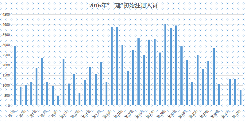 2016年,住建部共发布43批一级建造师初始注册人员名单,总人数共计89594人。