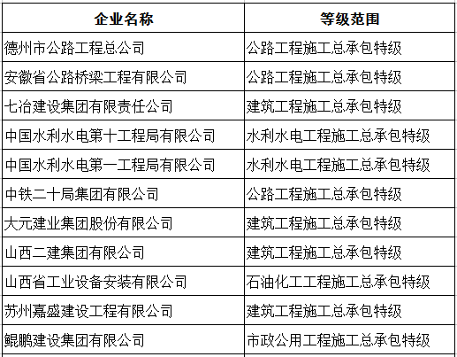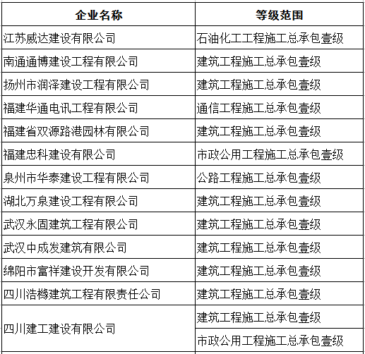住建部核准2016年第11、12批建设工程企业资质资格名单。共有21家企业升为特级资质(含特级资质增项),117家企业升为一级资质(含一级资质增项),2家企业获得贰级资质。